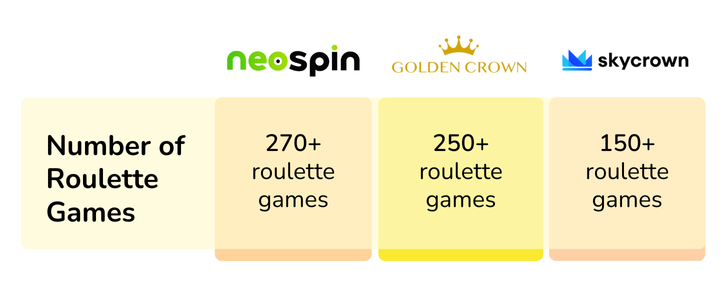 Neospin, Golden Crown, and SkyCrown are some of the best online roulette casinos thanks to their generous welcome bonuses and promotions, game variants, and fast cashouts.