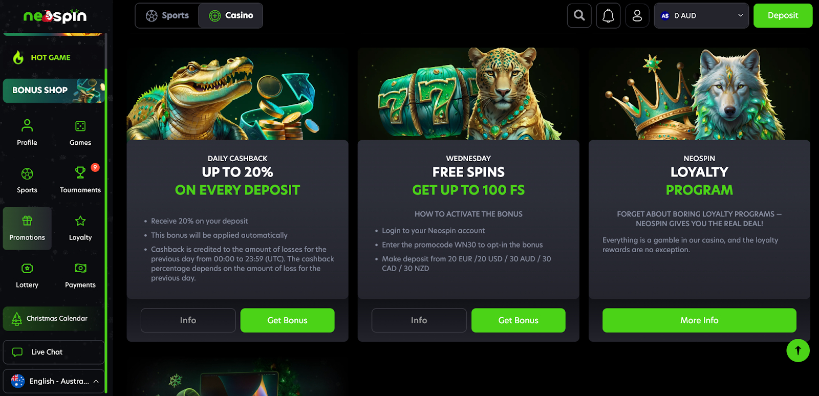 | Daily cashback | Neospin has an extensive and profitable bonus program where players can get daily cashback up to 20%. |