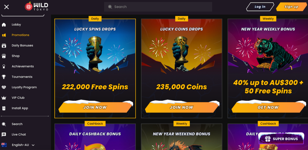 Use the code TOKYO15K during registration, and you can claim 250% up to A$5,300 + 600 free spins welcome bonus.