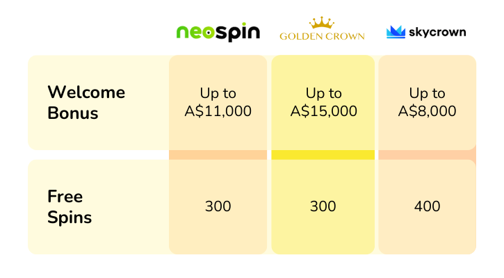 You’ve probably seen that Golden Crown leads the way here with a welcome bonus of up to A$15,000, with Neospin coming right after it. But if you’re looking for a generous amount of free spins, then SkyCrown might be the one for you.