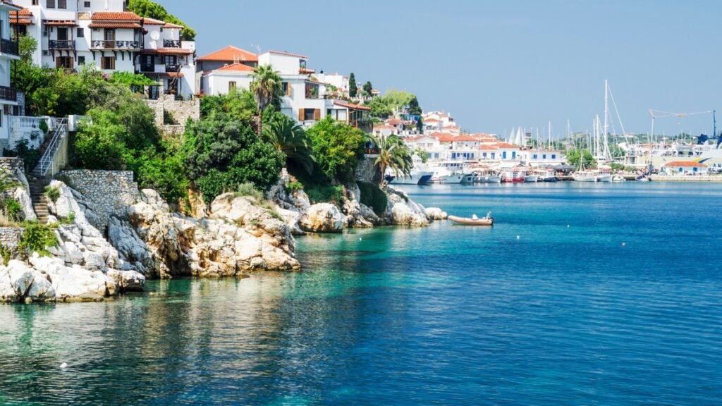 The bay is perfect for anchoring, swimming and paddleboarding. It’s a favorite among those exploring Greece by boat, thanks to its crystal-clear water and postcard-worthy natural setting.